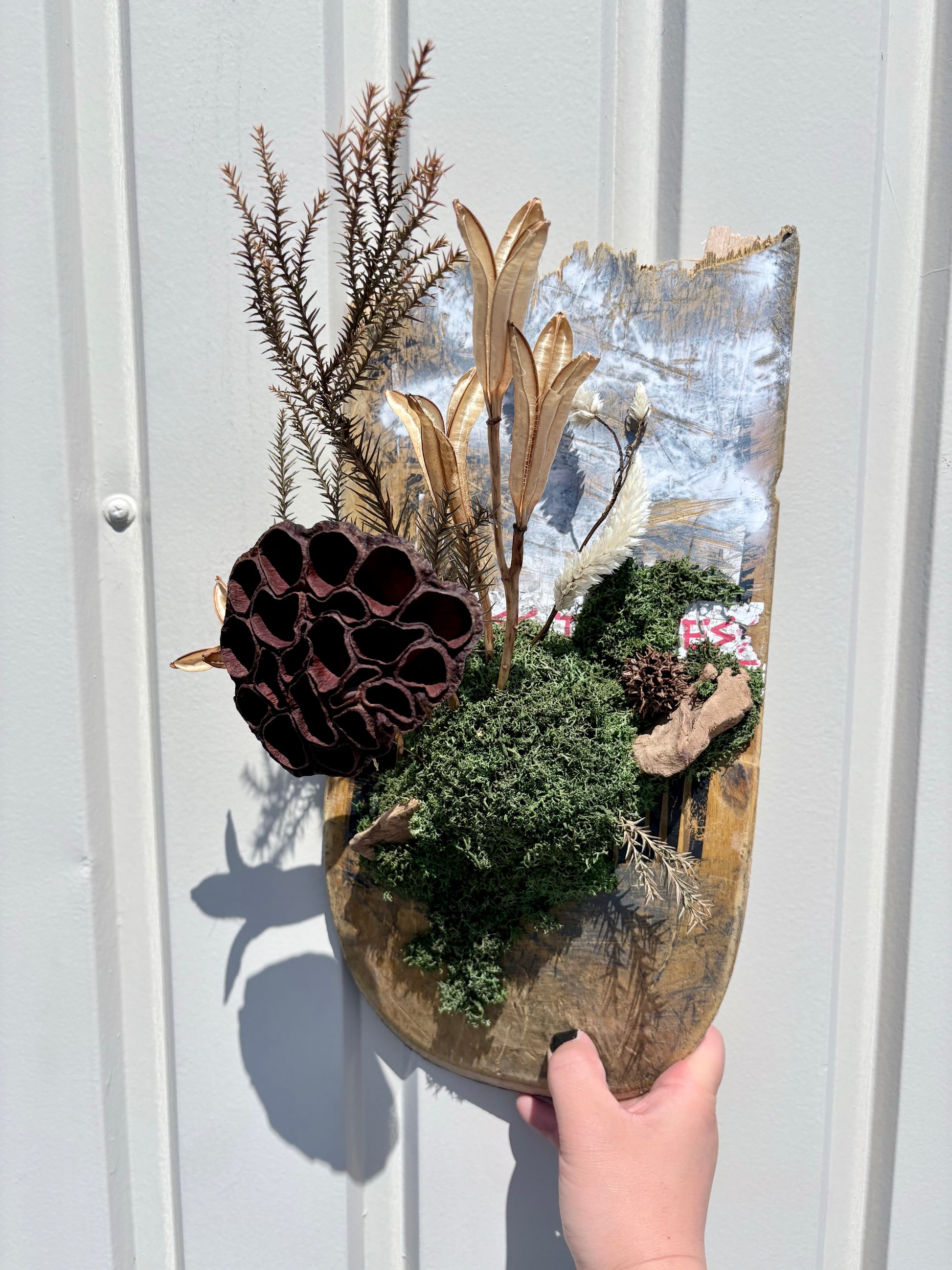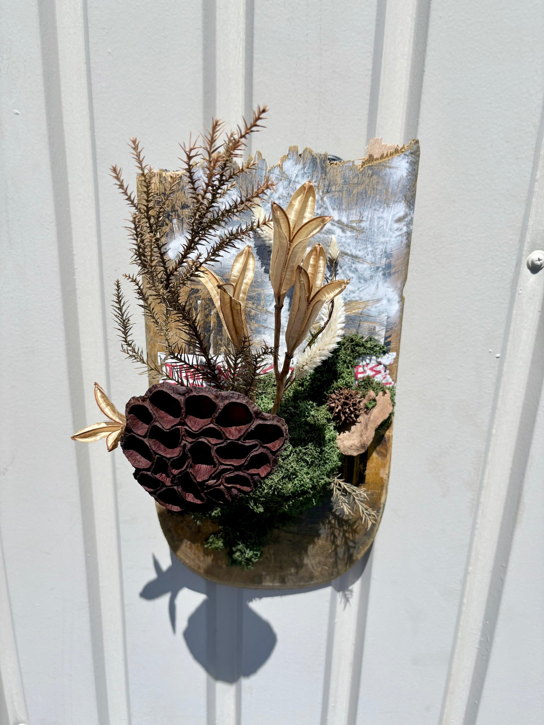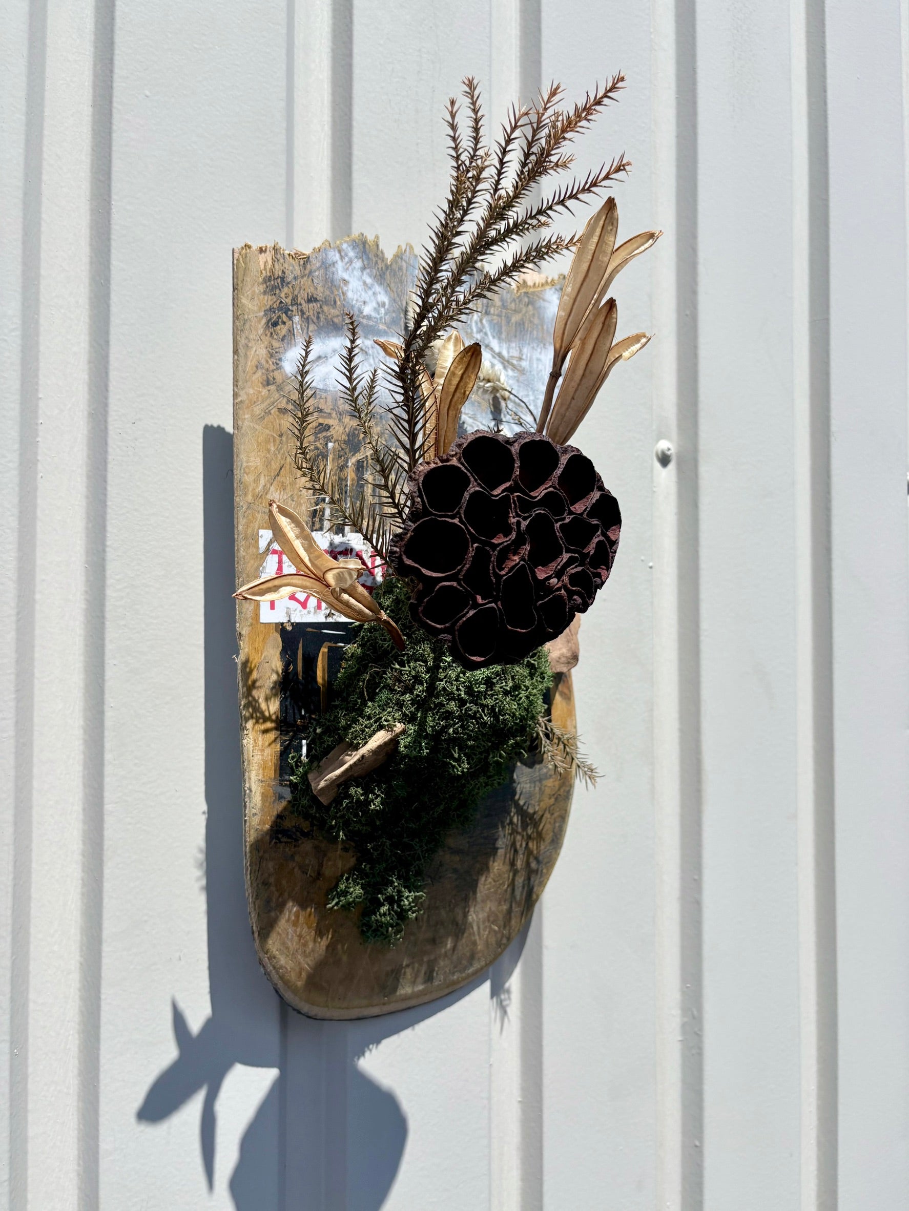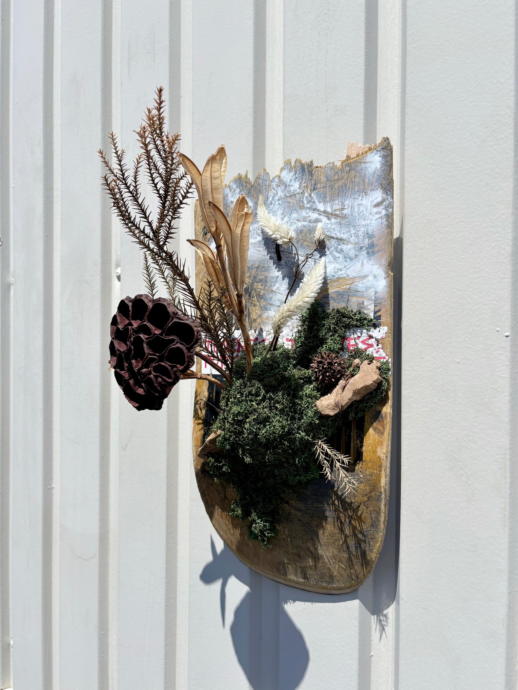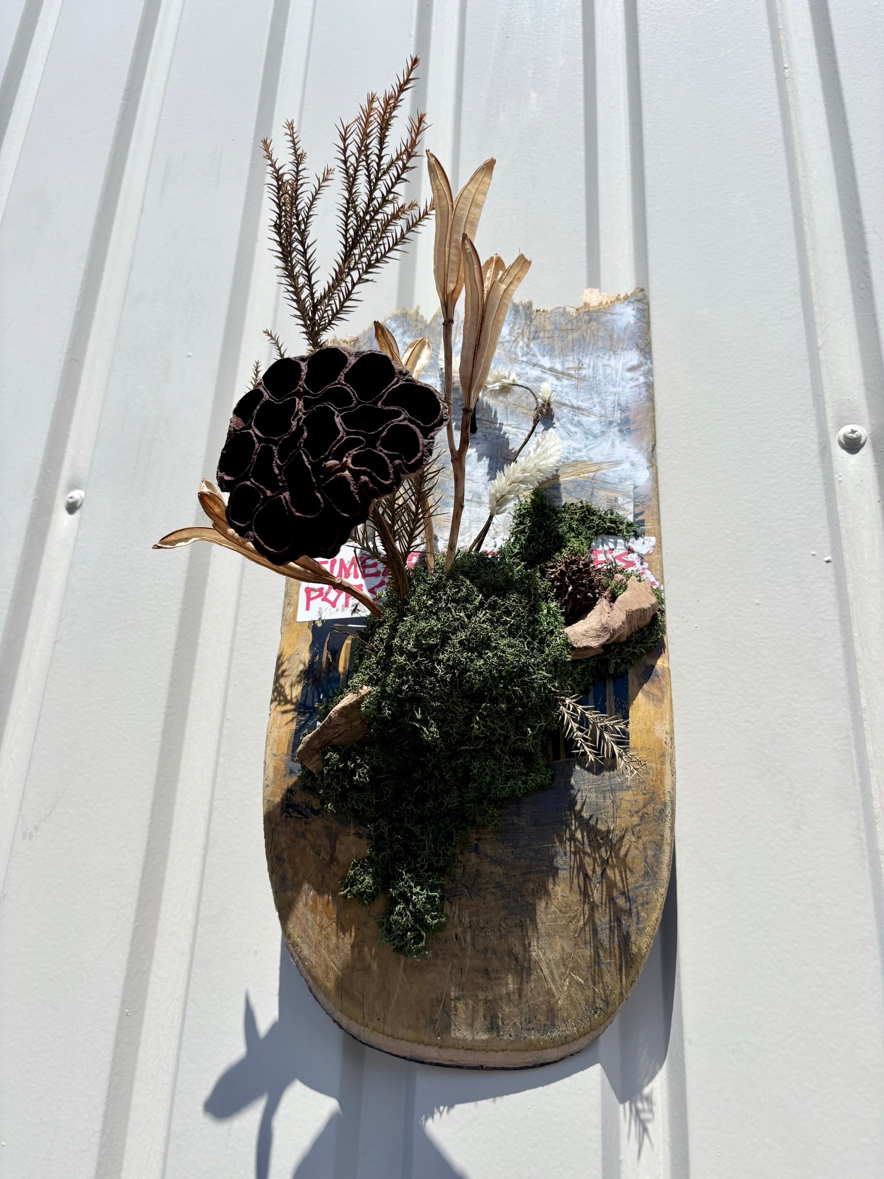 廃デッキにドライ素材を組み合わせた、壁掛け作品。