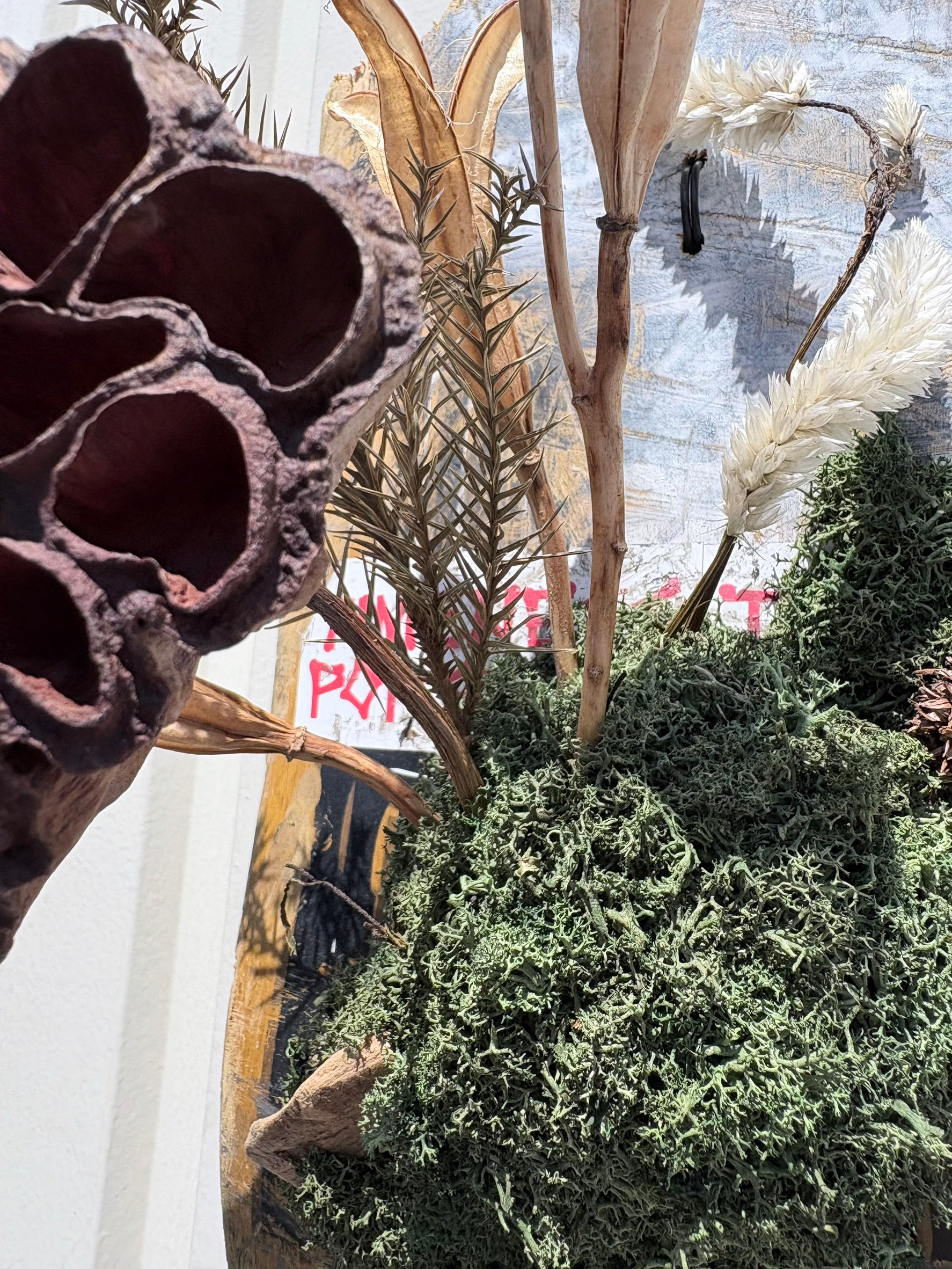 深いグリーンの苔の塊感を軸に、蓮の実の独特なフォルムと、縦に伸びるドライ素材を組み合わせた構成。