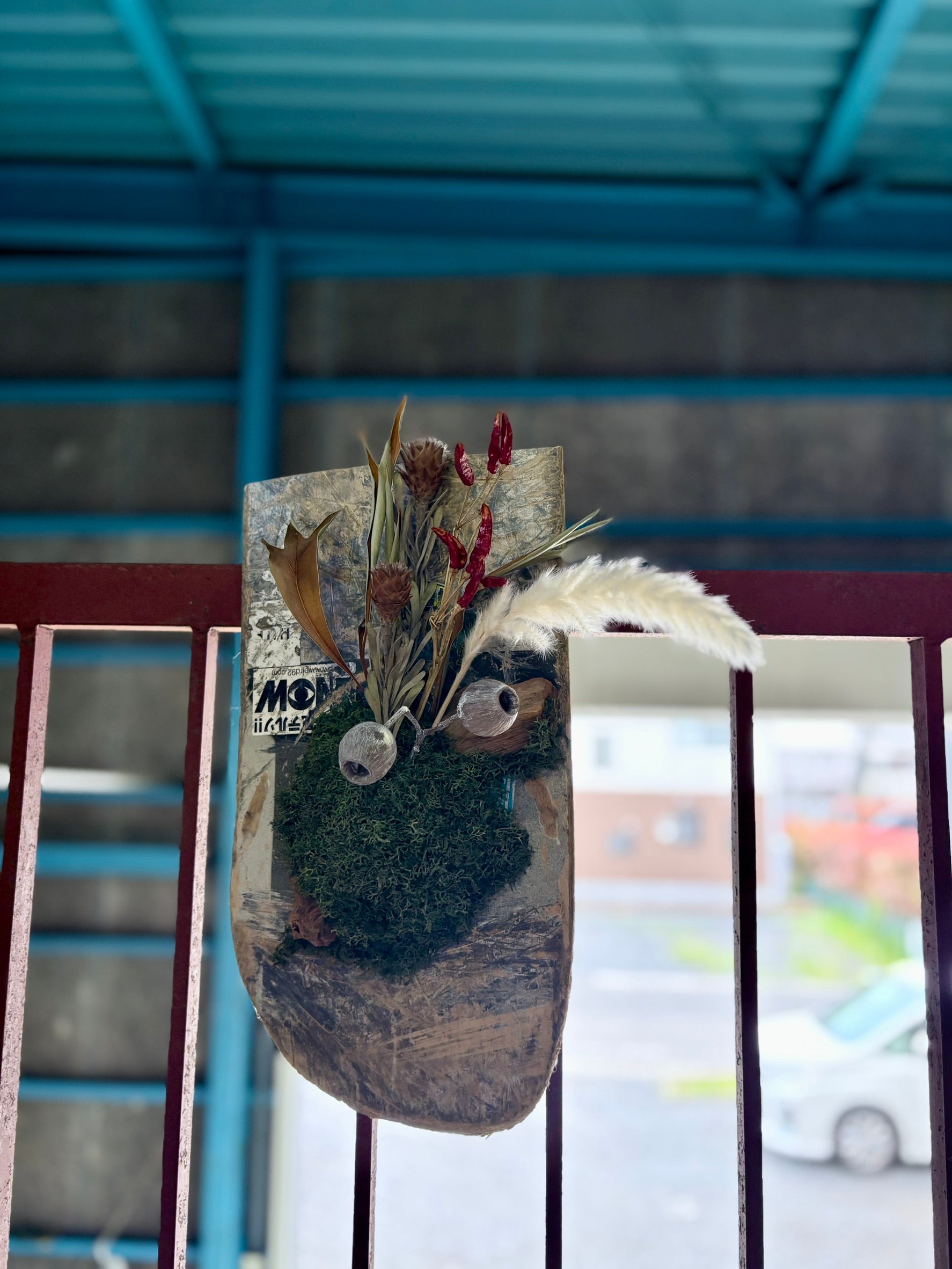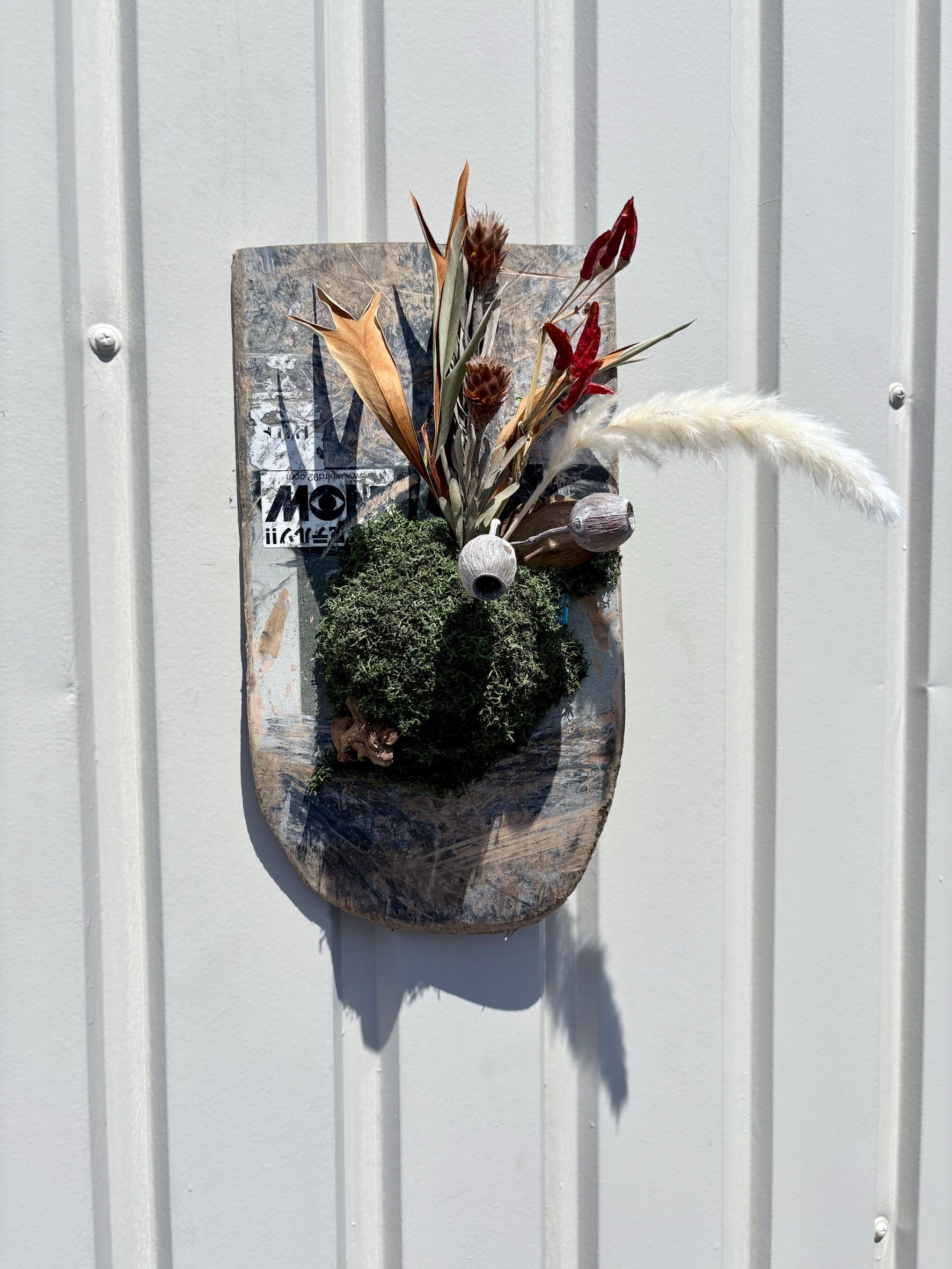 廃デッキにドライ素材を組み合わせた、壁掛け作品。